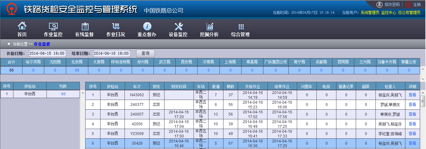 有货检作业的车站,一般成立了货检车间。该货检车间工作及管理人员使用的《铁路货检安全监控与管理系统》是全国铁路统一开发和使用的软件系统。成都货安计量技术中心有限公司是该软件系统的重要开发参与者和运维者。目前该系统已经在全路投入使用,并实现了三级联网,搭接在该系统中实现数据交换的有:安全门监控系统、轨道衡和超偏载系统、货检员现场作业看车时手持机系统等。